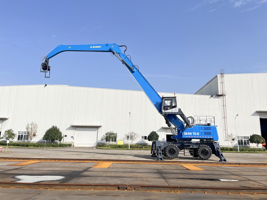 BHW70輪胎式港口碼頭抓鋼機(jī)適用于鋼廠料場裝卸廢鋼、裝卸火車皮物料、港口碼頭裝卸物料,廢鋼等,具有以下特點(diǎn):
